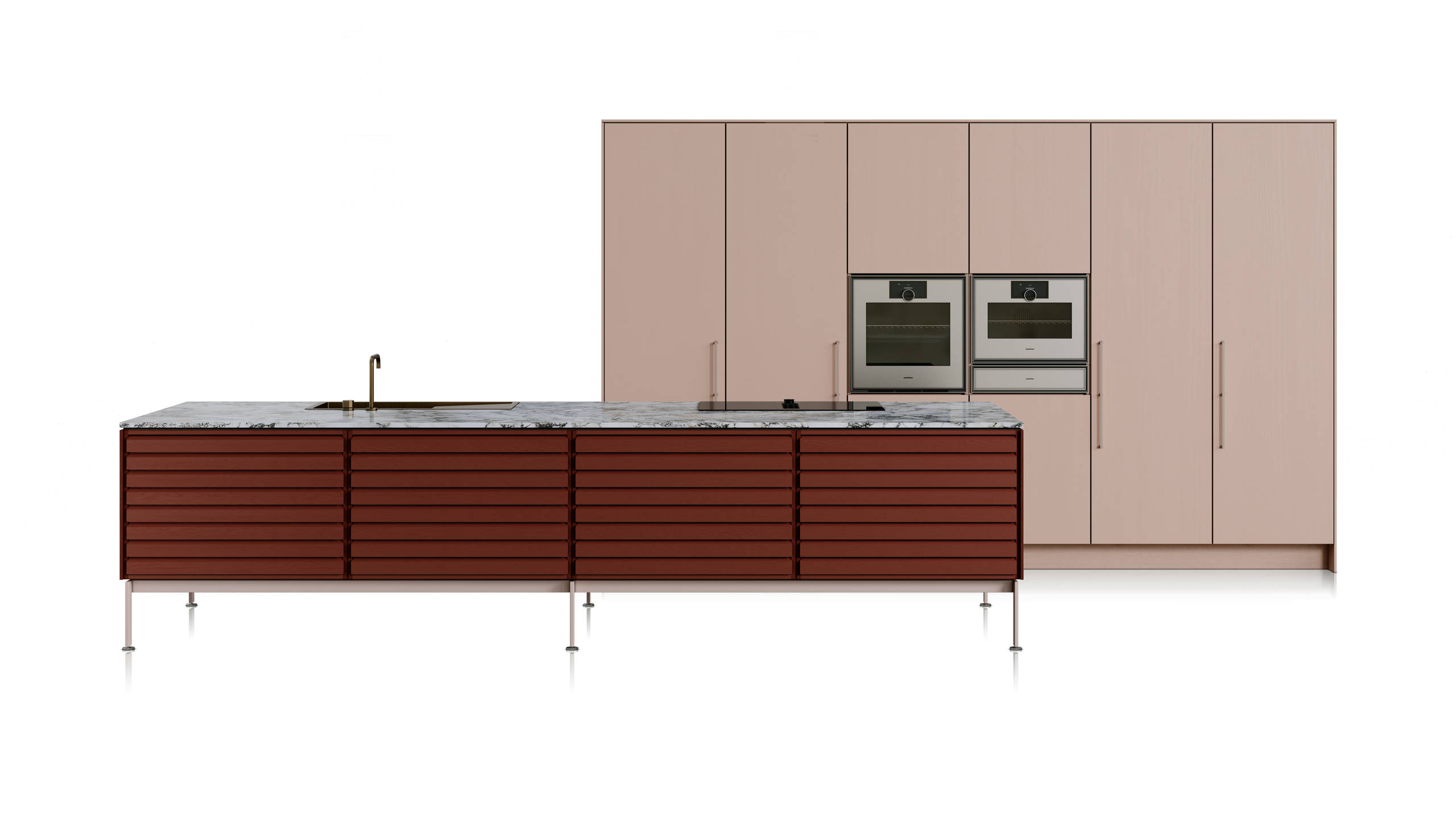 Lyxig harmoni med en köksö i Burgundy Red, kombinerad med benram i Dusty Rose och en högskåpsvägg i samma sofistikerade nyans.