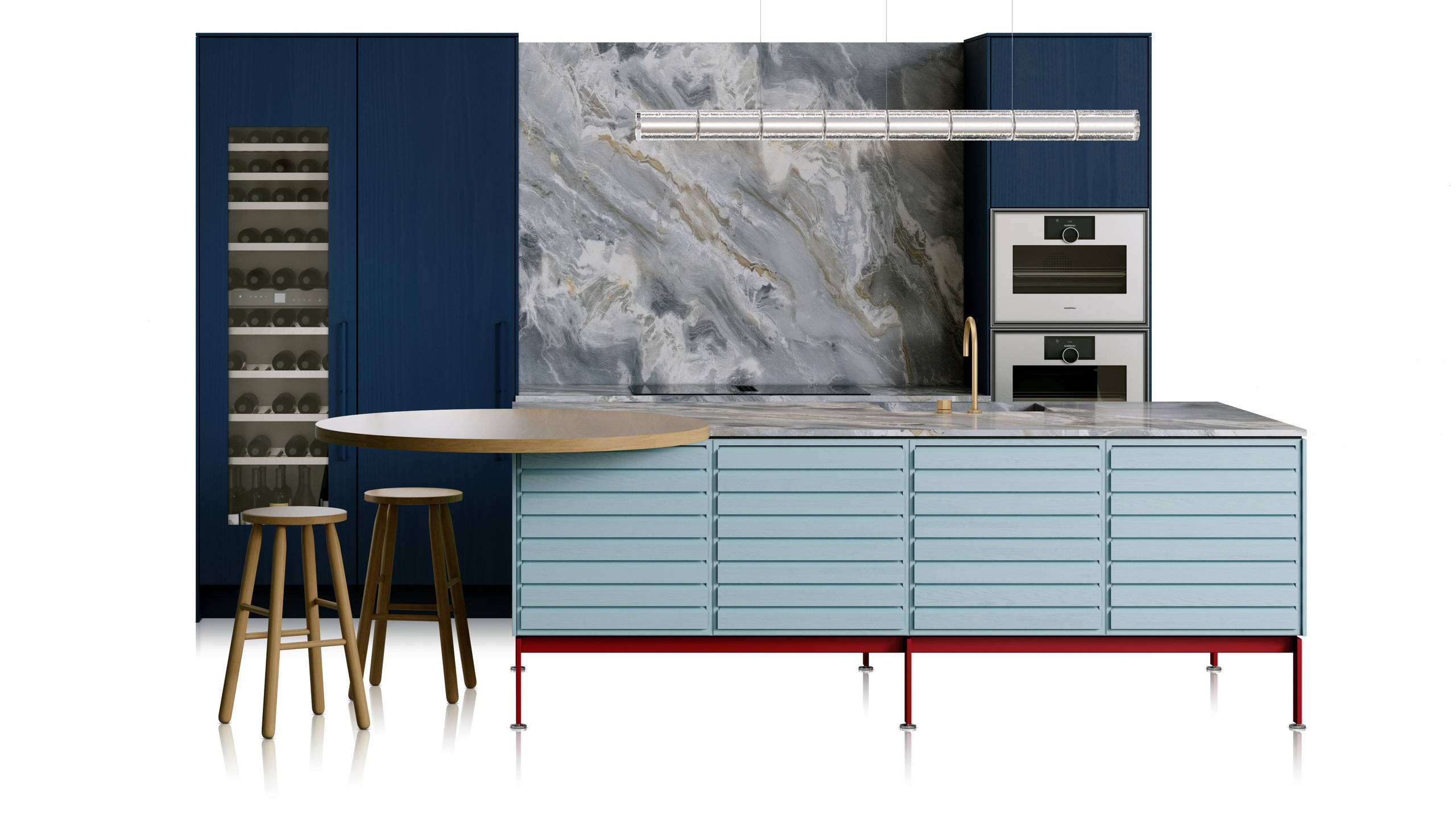 Classic Colour Collection finns i 11 noggrant utvalda färger. Här visas köksön i Sky Blue, i kombination med benram i Carmine Red och högskåpsvägg i Ocean Blue.
